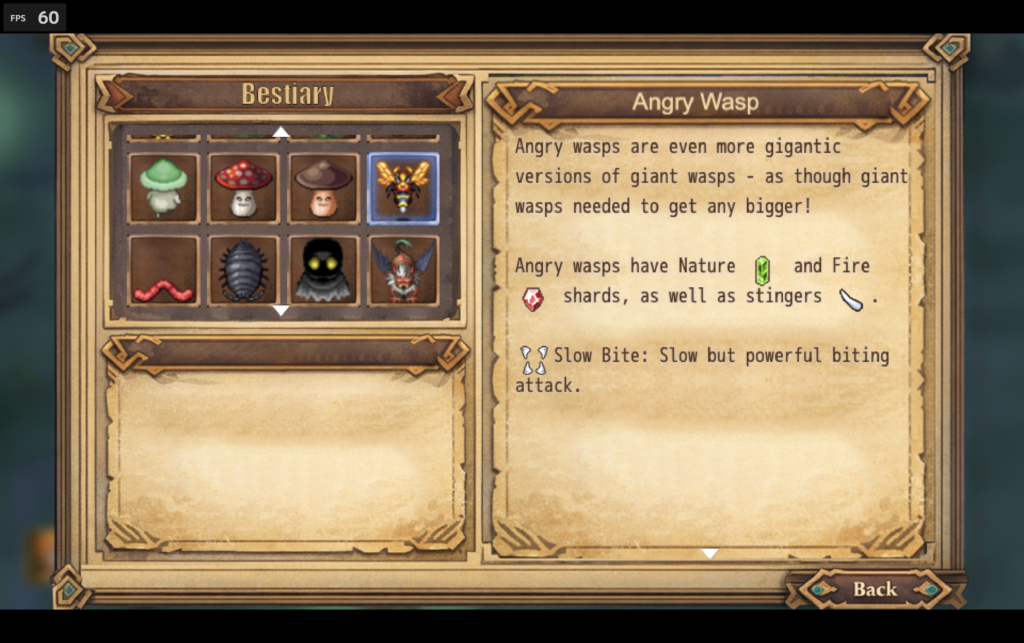 We also use the Lore Library plugin, which we reworked to be text-heavy instead of image-heavy, and which we copied into two nearly identical plugins to give us both a Lore Library and a Bestiary. These library tools let players understand the animals and monsters they fight: